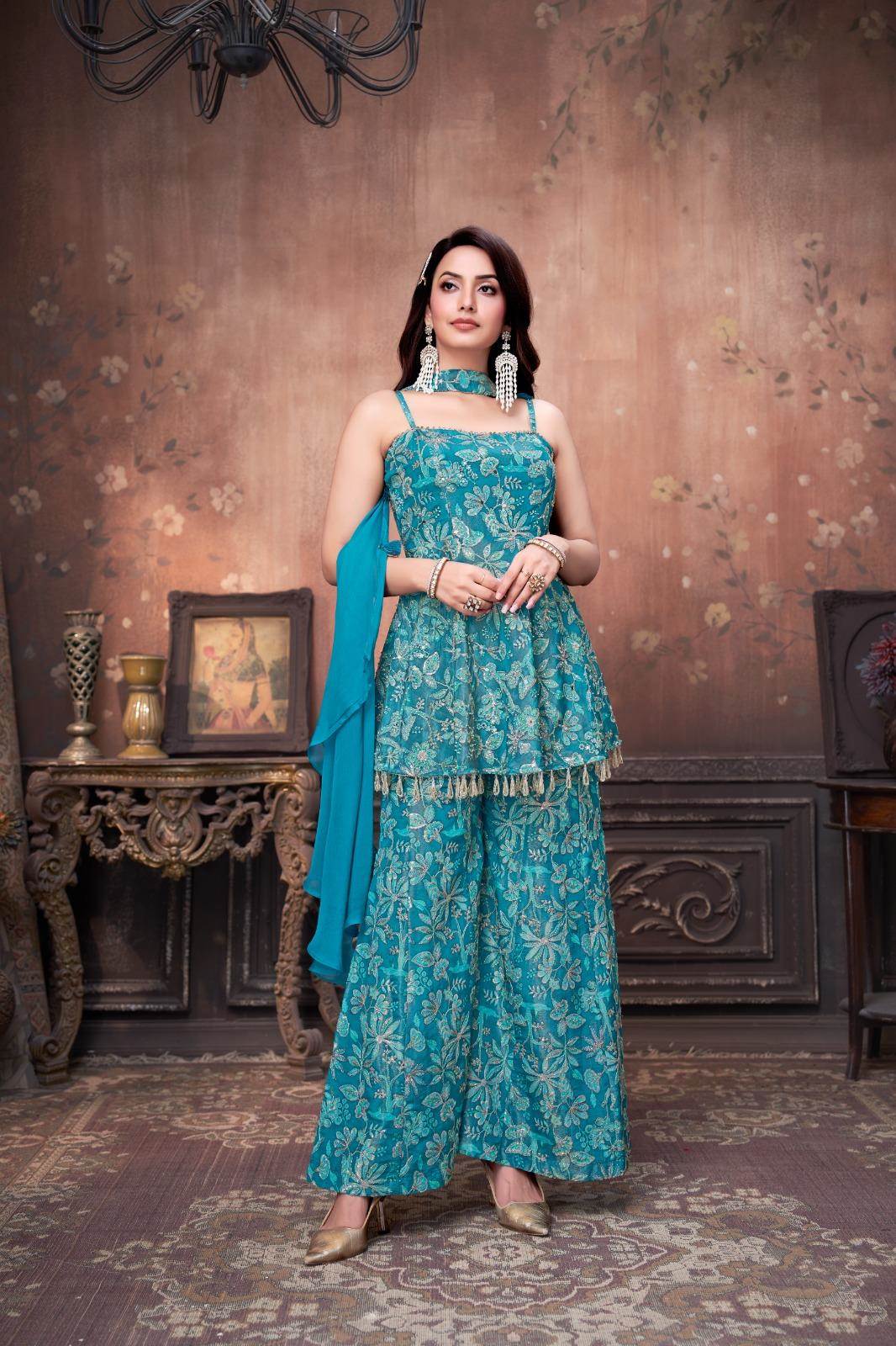 Sky Blue Color Spaghetti Style Indo-western Outfit