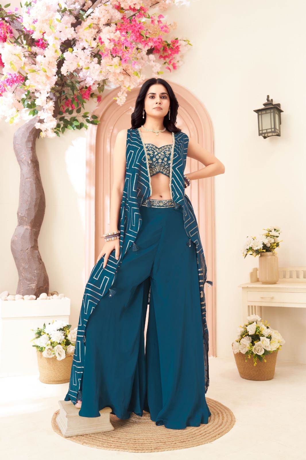 Blue Color Party Wear Designer Indo-Western Plazo Suit With Koti :: MY SHOPPY LADIES WEAR