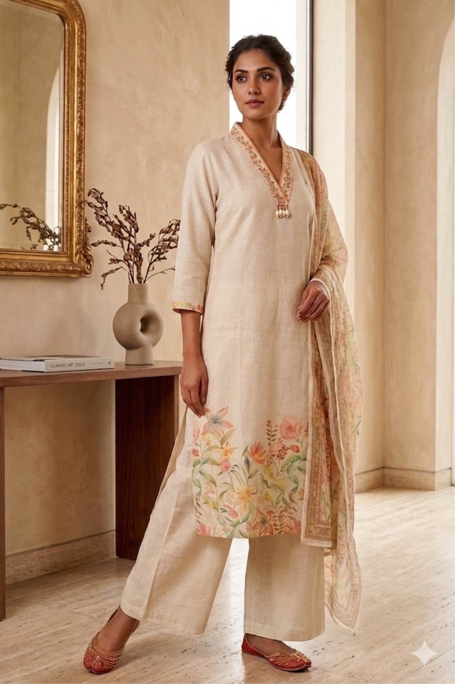 Cream color Casual wear cotton Dress with Dupatta :: MY SHOPPY LADIES WEAR