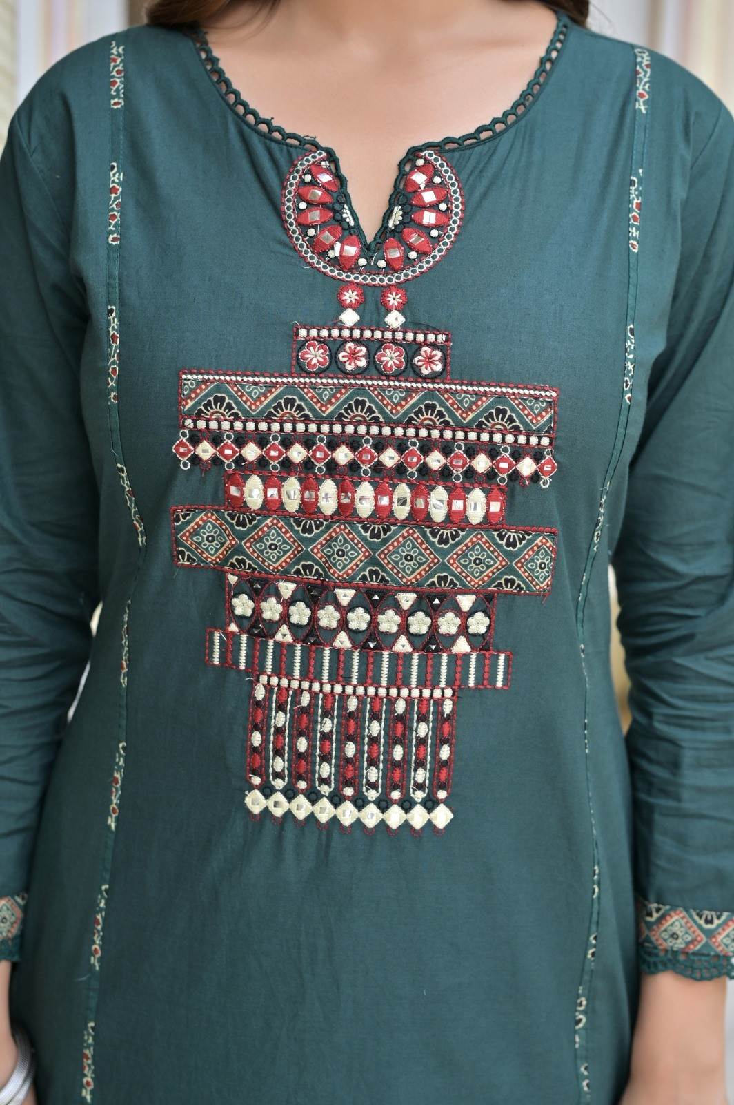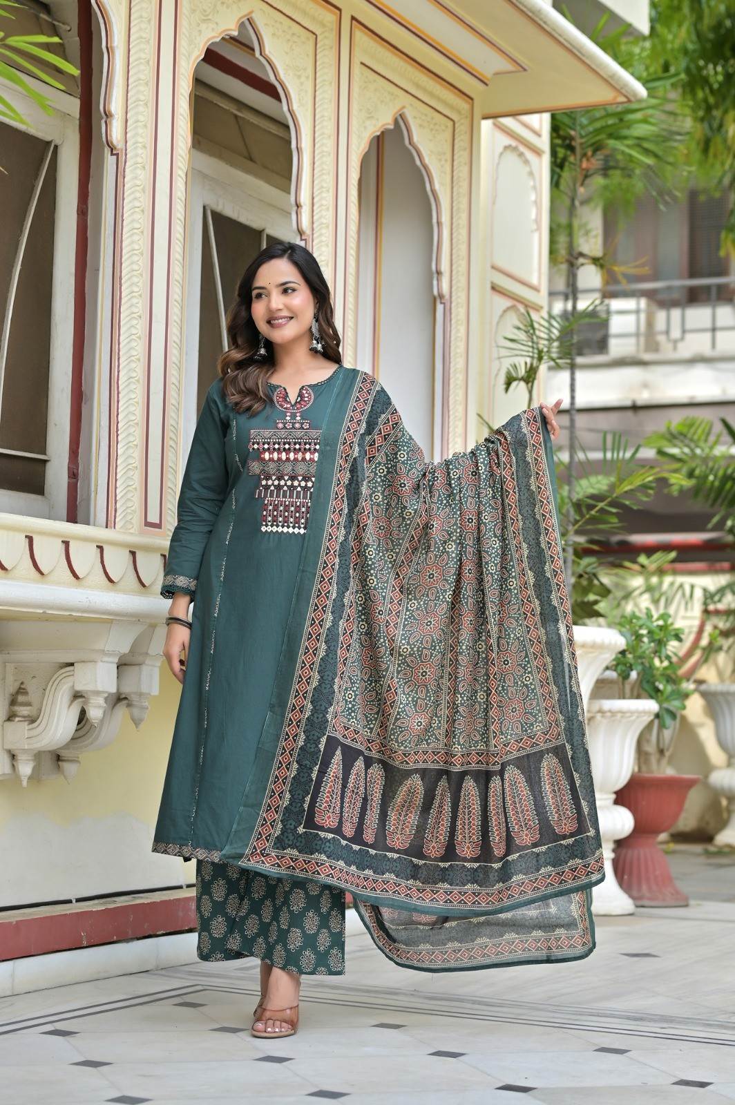Green color Casual wear Cotton Plazo Suit with Kalamkari dupatta :: MY SHOPPY LADIES WEAR