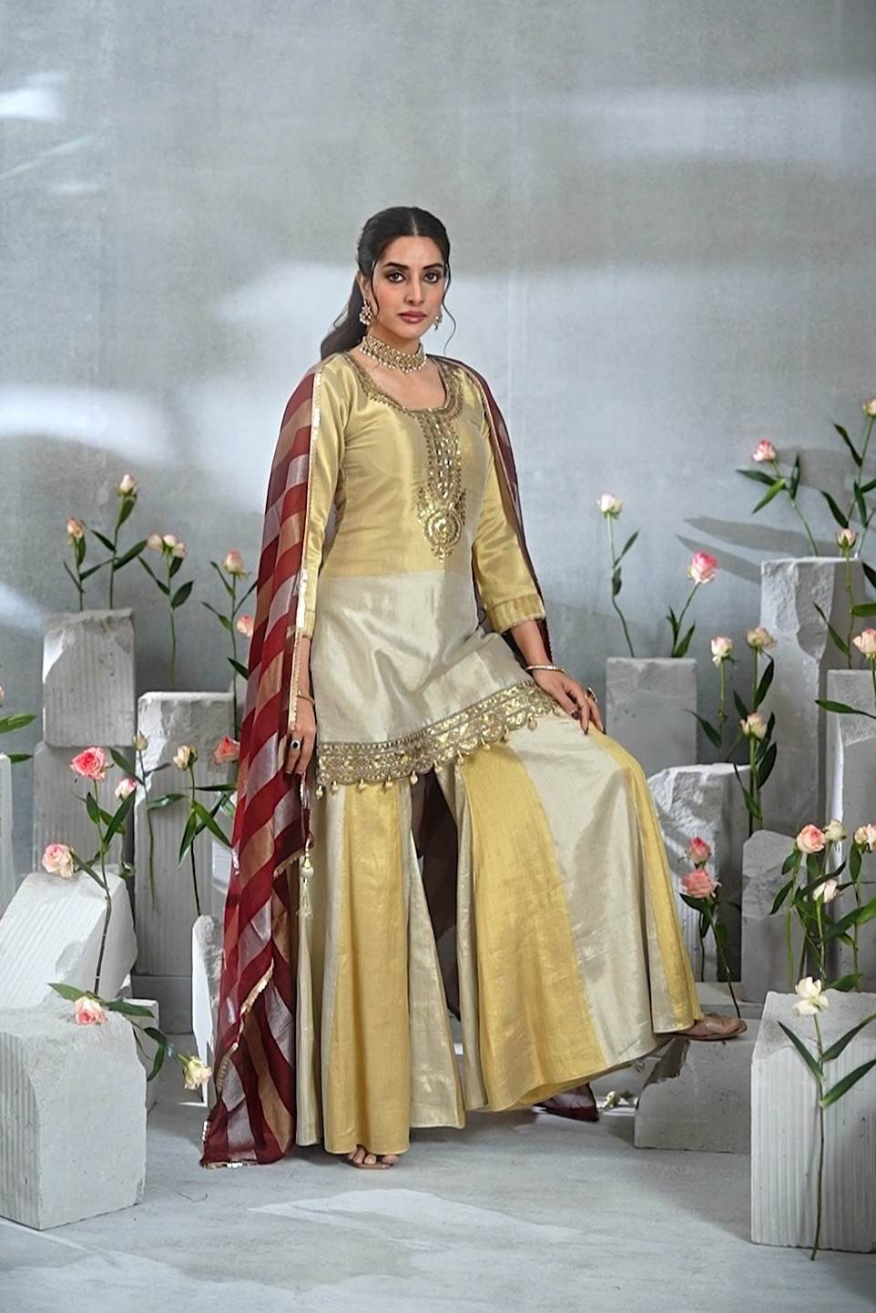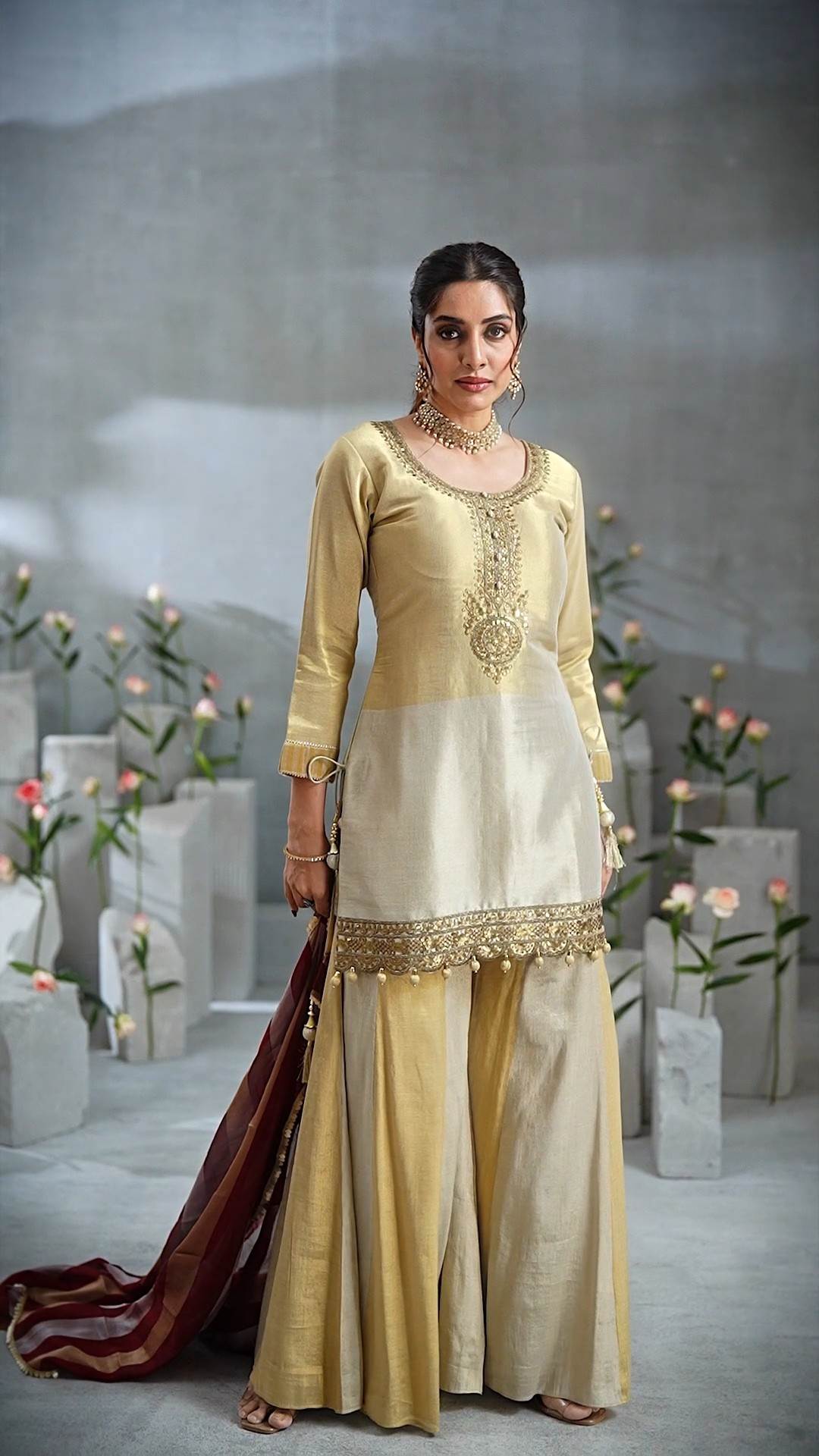 Gold color Indo-western Outfit with Maroon Dupatta