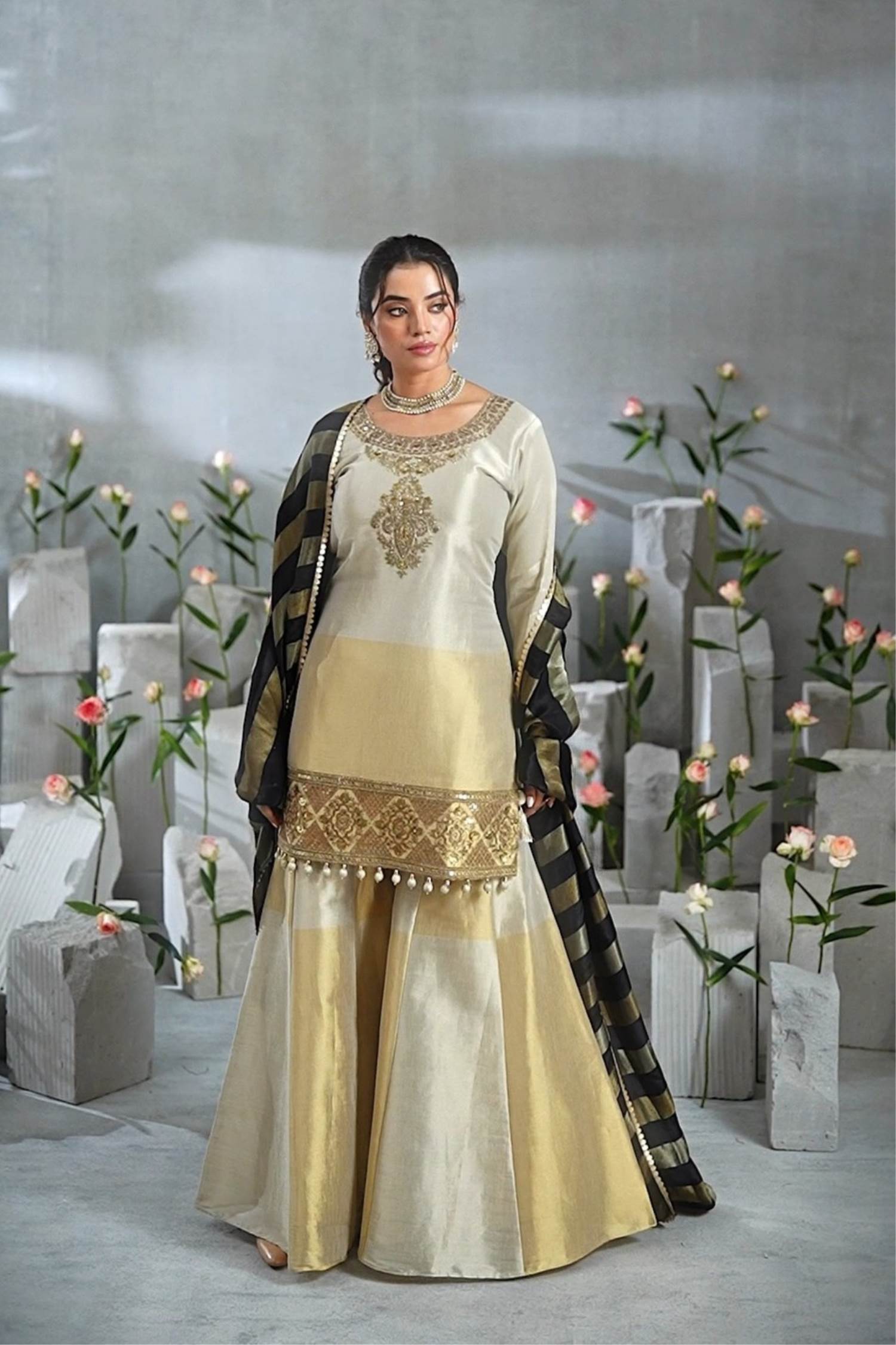 Golden Color Indo-western Outfit with Black Dupatta