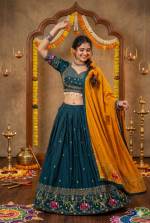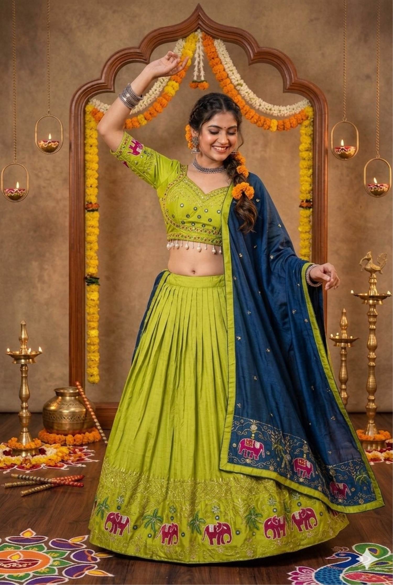 Parrot Green Color Navratri chaniya choli with Blue Dupatta