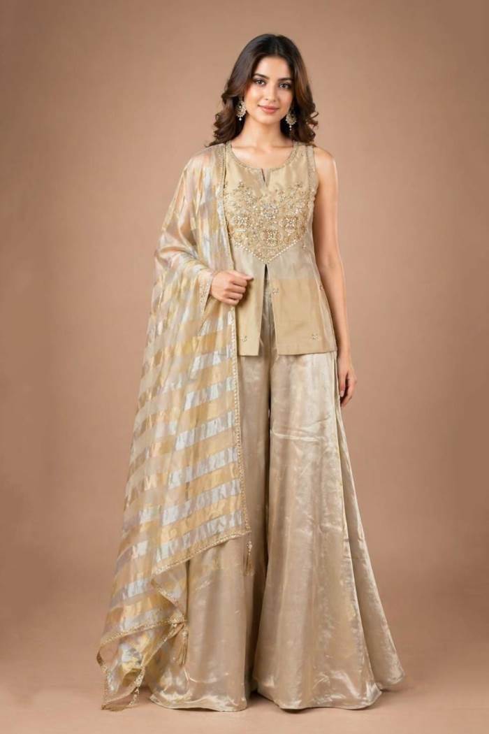 Gold Color Party Wear Designer Short Plazo Suit